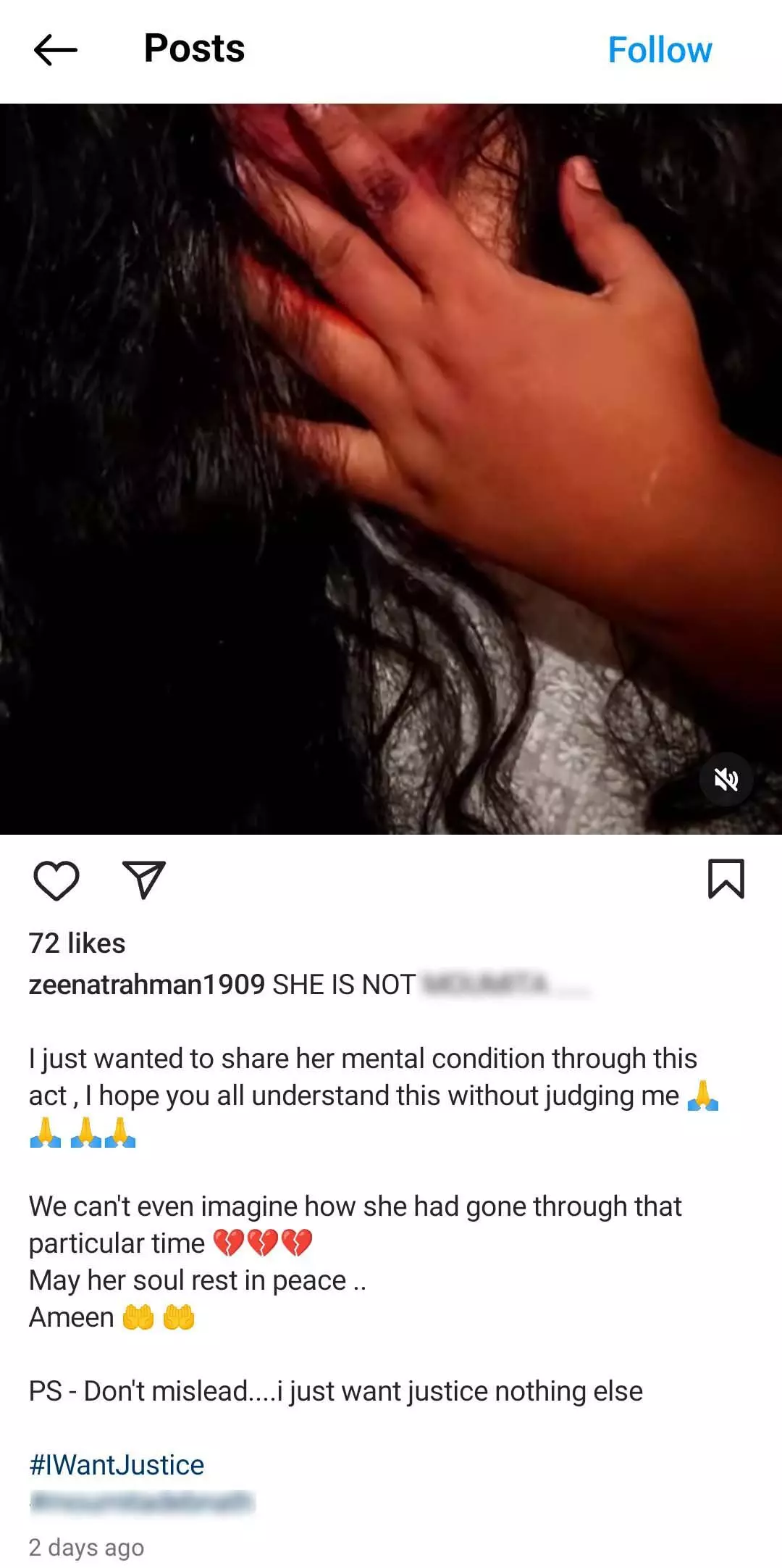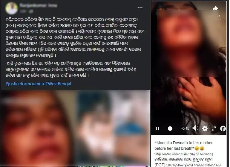 ତେବେ ସୋସିଆଲ ମିଡିଆରେ ୟୁଜର୍ସ ଉକ୍ତ ଭିଡିଓ କୁ ସେୟାର କରି ଉଲ୍ଲେଖ କରିଛନ୍ତି "ପଶ୍ଚିମବଙ୍ଗର କଲିକତା ସ୍ଥିତ ଆର୍ ଜି କେଏଆର୍ ମେଡିକାଲ କଲେଜରେ ପୋଷ୍ଟ ଗ୍ରାଜୁଏଟ ଟ୍ରେନୀ (PGT) ପାଠ୍ୟକ୍ରମରେ ଦ୍ଵିତୀୟ ବର୍ଷରେ ଅଧ୍ୟୟନ ରତ ଥିବା ୩୧ ବର୍ଷୀୟ ମୋମିତା ଦେବନାଥଙ୍କୁ ବଳାତ୍କାର କରିବା ପରେ ବିଭତ୍ସ ହତ୍ୟା କରାଯାଇଛି । ପଶ୍ଚିମବଙ୍ଗର ମୁଖ୍ୟମନ୍ତ୍ରୀ ନିଜେ ଗୃହ ମନ୍ତ୍ରୀ ଏବଂ ସ୍ବାସ୍ଥ୍ୟ ମନ୍ତ୍ରୀ ଦାୟିତ୍ବରେ ଥାଇ ମଧ୍ୟ ଏଭଳି ଘଟଣା ଘଟିବା ପରେ ଦୋଷୀକୁ ଦଣ୍ଡ ନମିଳିବା ଅତ୍ୟନ୍ତ ନିନ୍ଦନୀୟ ବିଷୟ ଅଟେ । "