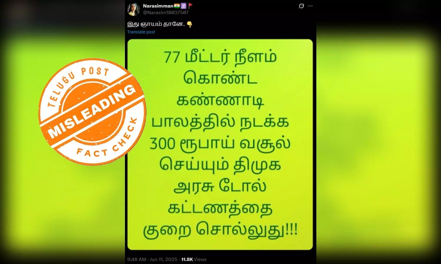 மேற்கூறப்பட்ட தகவல்கள் குறித்து TeluguPost உண்மை கண்டறியும் குழு விசாரணை நடத்தியதில், வேறு கட்டணங்களை கன்னியாகுமரி கண்ணாடி இழை பாலத்திற்கான கட்டணம் என தவறாக சித்தரித்து பகிரப்படுவது கண்டுபிடிக்கப்பட்டது.