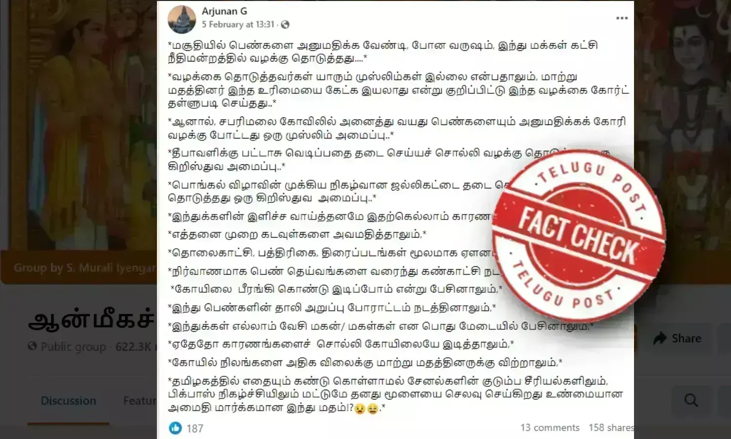 சபரிமலை கோவிலுக்குள் அனைத்து வயது பெண்களையும் அனுமதிக்க வேண்டும் என்று நீதிமன்றத்தை அணுகியவர்கள் இந்துக்கள் தான், அது இஸ்லாமிய அமைப்பு அல்ல என கண்டுபிடிக்கப்பட்டு சமூக ஊடகங்களின் கூற்றுகள் பொய் என்று நிரூபிக்கப்பட்டது.