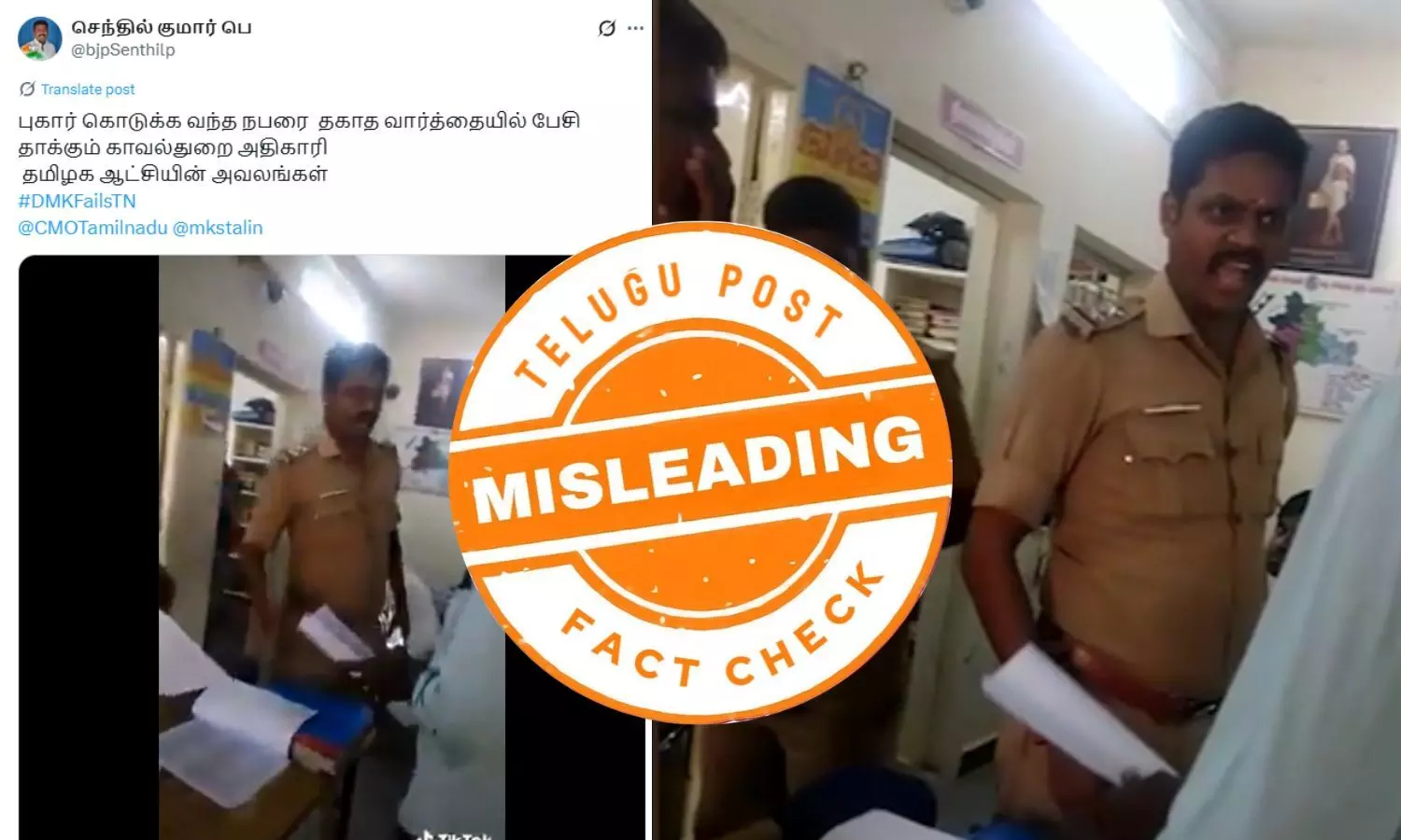 வைரல் வீடியோவைப் பகிர்ந்த செந்தில் குமார் பெ என்ற எக்ஸ் பதிவர், “புகார் கொடுக்க வந்த நபரை தகாத வார்த்தையில் பேசி தாக்கும் காவல்துறை அதிகாரி. தமிழக ஆட்சியின் அவலங்கள்” என்று குறிப்பிட்டு இருந்தார். மேலும் DMKFailsTN எனக் குறிப்பிட்டதோடு முதல்வர் மு.க.ஸ்டாலினின் எக்ஸ் பக்கத்தையும் டேக் செய்திருந்தார்.