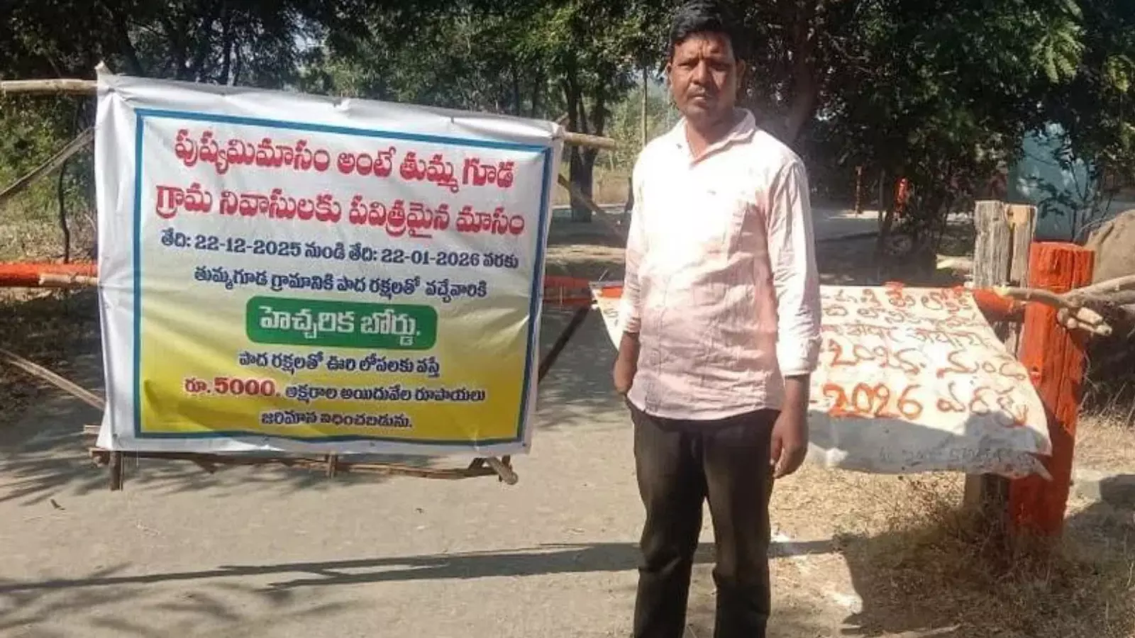 ఆ గ్రామంలో ఫ్లెక్సీని ఏర్పాటు చేసి ఈ నిబంధనను ప్రకటించారు. నెల రోజుల పాటు అమలయ్యే నిబంధనను ప్రస్తుతం చుట్టుపక్కల ప్రాంతాల్లో చర్చనీయాంశంగా మారింది. పుష్యమాసంలో ఆదివాసీలు కఠిన ఆచార సంప్రదాయాలను పాటిస్తుంటారు. స్థానికంగా ఆదివాసీలుగా పిలిచే గిరిజనులు మంగళవారం నుంచి జనవరి 22 వరకు పుష్యమాస పూజలు నిర్వహిస్తారు. ఈ పవిత్ర కాలంలో మద్యం సేవించరు, పొగ తాగరు, నేలపై నిద్రిస్తారు, చెప్పులు లేకుండా నడవడం సంప్రదాయంగా పాటిస్తారు. గ్రామంలోకి వచ్చే బయటి వారు గ్రామ సరిహద్దుల్లోనే తమ చెప్పులు విడిచిపెట్టి లోపలికి రావాలని స్పష్టం చేశారు. నిబంధనను ఉల్లంఘిస్తే జరిమానా తప్పదని హెచ్చరించారు.