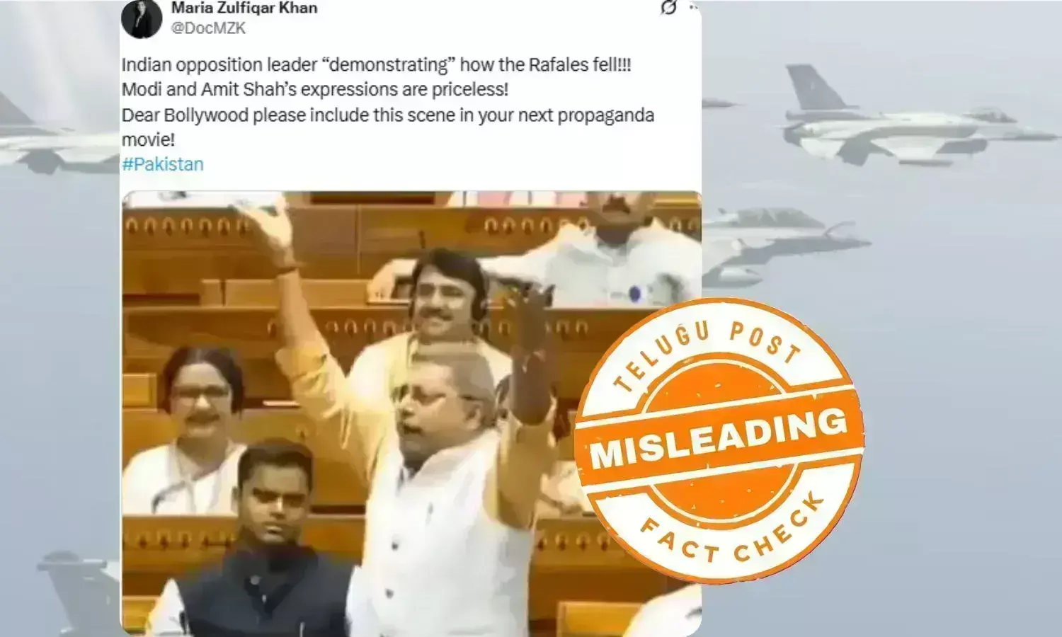 اس درمیان سوشل میڈیا پر چند پاکستانی صارفین لوک سبھا میں بی جے پی کو ہدف تنقید بنانے والے ترنمول لیڈر کے رکن پارلیمان کا ایوان میں خطاب کا ویڈیو کلپ شئیر کرتے ہوئے دعویٰ کرر ہے ہیں کہ "بھارت کے اپوزیشن لیڈر "دکھا رہے ہیں" کہ رافیل طیارے کیسے تباہ ہوگئے۔ وزیر اعظم ہند نریندر مودی اور وزیر داخلہ امیت شاہ کے چہرے دیکھنے لائق ہیں۔
