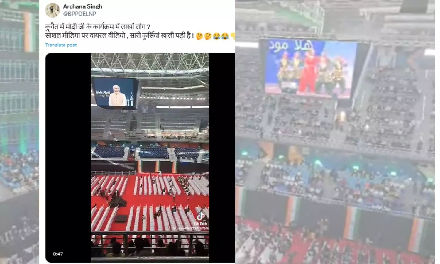 ارچنا سنگھ نامی ایکس صارف نے اس ویڈیو جو شئیر کرتے ہوئے لکھا کہ " کویت میں مودی جی کے پروگرام میں لاکھوں لوگ؟ سوشل میڈیا پر وائرل ویڈیو۔ ساری کرسیاں خالی پڑی ہیں۔"