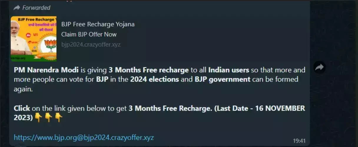 سال 2024 میں ہونے والے عام انتخابات سے قبل، بھارتیہ جنتا پارٹی تمام ہندوستانی موبائل سروس صارفین کو تین ماہ کا مفت ریچارج فراہم کر رہی ہے ایسا دعویٰ کرنے والا پیغام، واٹس ایپ پر تیزی سے گردش کر رہا ہے۔ اس آفر کو فروغ دینے والے پیغام میں ویب سائٹ کا لنک بھی ہے۔